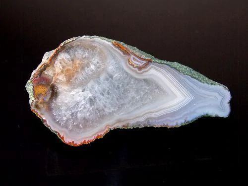 Krásný achát s křemenným jádrem pocházející z katastru obce Bradlecká Lhota o velikosti 6,2 x 3,4cm, celá polovina, leštěný.