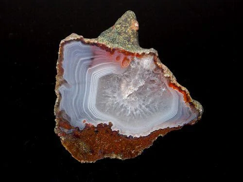 Krásný výrazný achát s křemenným jádrem pocházející z katastru obce Bradlecká Lhota o velikosti 5 x 4,2cm, celá polovina, leštěný.
