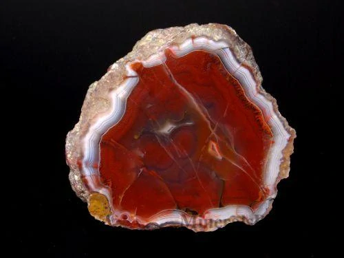 Pěkný achát s rudou výplní a efektní kresbou po obvodu pocházející z lomu v Doubravici o velikosti 6,5 x 5,6cm, leštěný.