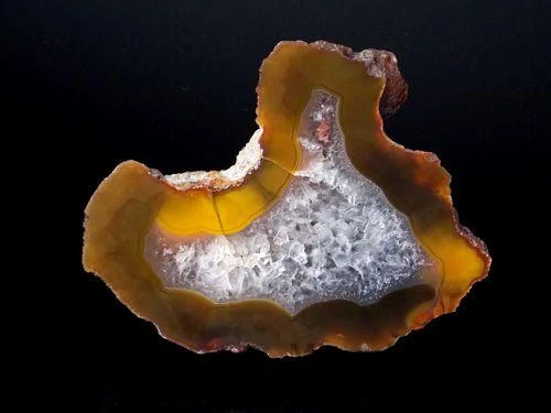 Pěkný achát s typickou kresbou a křemenným jádrem pocházející z argentinské lokality El Resbalon o velikosti 9 x 7 x 2,9cm, nepatrně poškozená zadní část, leštěný.