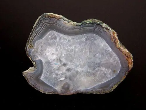 Achát s jemnou kresbou a křemenným jádrem pocházející z lokality Kozlov o velikosti 6,5 x 5,1cm, celá polovina, leštěný.