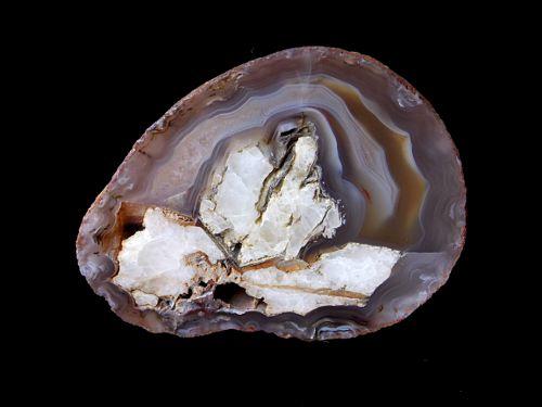 Pěkný achát s kalcitem pocházející z africké lokality Ngabu o velikosti 5,7 x 4,5 x 2,3cm. Vzorek má uraženou zadní část.