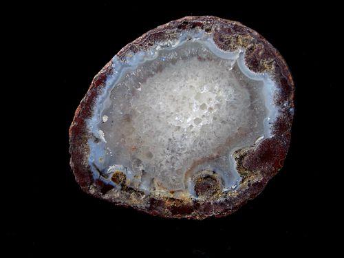 Pěkný achát s křemenným jádrem pocházející z africké lokality Ngabu o velikosti 4,2 x 3,5 x 1,4cm. Vzorek má kompletní zadní část.