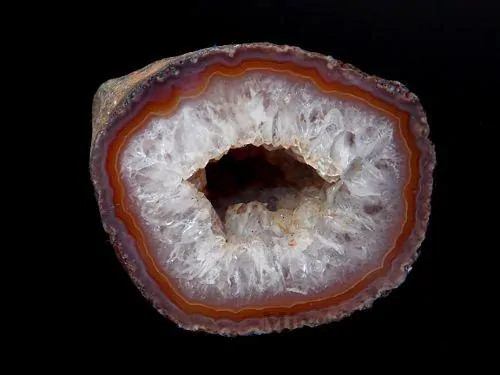 Geoda s achátovým lemem pocházející z africké lokality Ngabu o velikosti 4,4 x 3,7 x 5cm. Vzorek má kompletní zadní část.