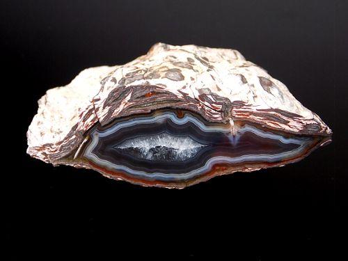 Krásný achát v efektní kombinaci s ryolitem pocházející z turecké lokality North Ankara o velikosti 7,3 x 2,6cm, zaoblená hrana, leštěný.
