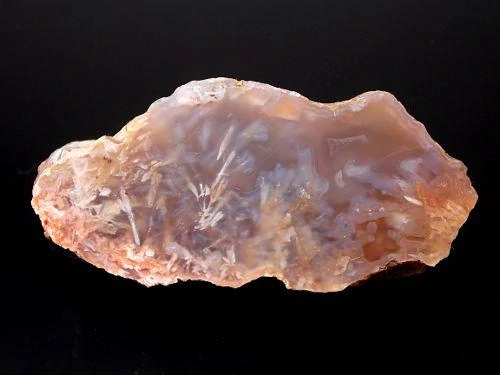 Krásný achát s typickýma pseudomorfózama pocházející z lokality Rovně o velikosti 7,3 x 3,7cm, celá polovina, leštěný
