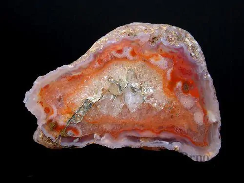 Menši achát s červeným lemem a křemenným jádrem pocházející z lokality Rovně o velikosti 3,6 x 2,4cm, celá polovina, leštěný