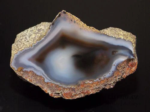 Achát - Železnice Achát s flekatou černou kresbou pocházející z lokality Železnice o velikosti 5 x 3,5cm. Celá půlka, leštěný. celý popis