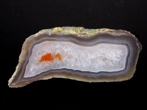 Krásný čistý achát s jemnou kresbou a křemenný jádrem pocházející z lokality Železnice o velikosti 6,7 x 2,6cm. Celá polovina, leštěný.