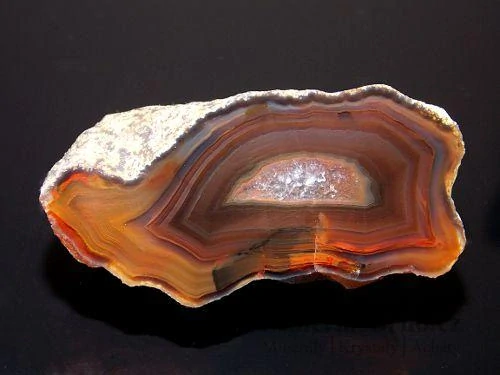 Achát s pěknou barevnou kresbou a křemenným jádrem pocházející z lokality Železnice o velikosti 5,2 x 2,7cm. Celá polovina, zaoblená hrana, leštěný.