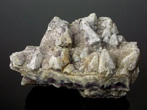 Kombinace plísňových krystalů a zonálního hradbového ametystu z bochovických žil. Vzorek má velikost 10,5 x 7,7x 5,2cm.