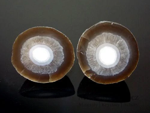 Zajímavý řez chalcedonovou koulí o velikosti 3,4 x 3,2 x 3,3cm pocházející z marocké lokality Buu Craa v provincii Laayoune. Obě poloviny, leštěné
