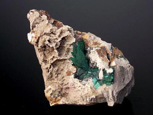 Luxusní agregáty tvořené drobnými vláknitými malachitovými jehlicemi s perleťovým leskem na podložce pocházející z marocké lokality Kerrouchen. Vzorek má celkovou velikost 8 x 5,6 x 6cm. Velikost malachitového agregátu v dutině je 4,2 x 2cm.