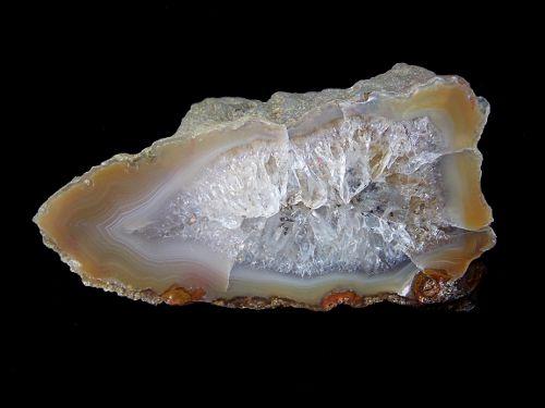 Krásný achát s jemnou barevnou kresbou a křemenným jádrem s jiskrou pocházející z katastru obce Bradlecká Lhota o velikosti 6 x 3,2cm, celá půlka, leštěný.