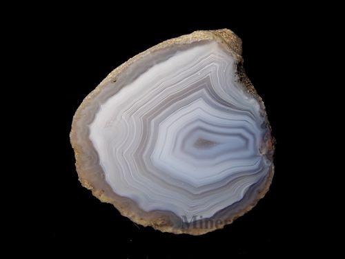 Menší achát s efektním proužkováním pocházející z lokality Levín. Celá polovina, leštěný.