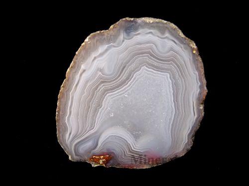 Pěkný achát s jemnou kresbou a efektním vtokovým kanálkem pocházející z lokality Levín o velikosti 3,5 x 3,8cm. Celá půlka, leštěný.