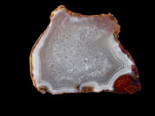 Krásný achát s jemnou kresbou po obvodu a křemenným jádrem pocházející ze Staropacké hory o velikosti 5,7 x 4,6cm, celá půlka, leštěný.