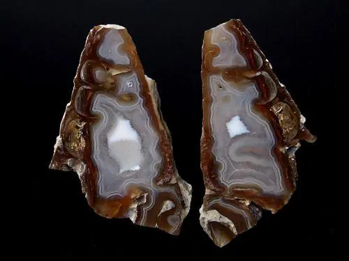 Velmi efektní a estetická schránka (ulita) plže kompletně nahrazená chalcedonem a achátem pocházející ze sedimentů eocénu v okolí města Dakhla v marocké poušti. Schránka je přeříznuta a vyleštěna.