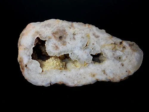 Krásná geoda se zajímabou dutinou pocházející z pole v Rudici o velikosti 11,3 x 6,1cm. Celá půlka, leštěná.
