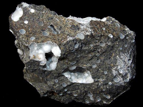 Velikost vzorku 9,5 x 6 x 4,3cm, velikost dutin 2,5 x 2cm, velikost kulovitých agregátů thomsonitu až 7mm. Estetická a nepoškozená ukázka.