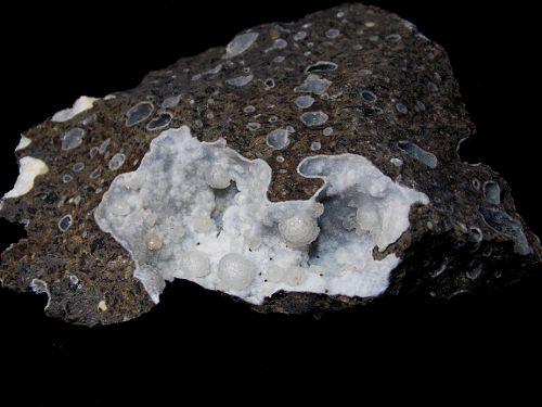 Velikost vzorku 8,5 x 6,7 x 3,7cm, velikost dutiny 5 x 3cm, velikost dominantního kulovitého agregátu thomsonitu 8mm. Estetická a nepoškozená ukázka.