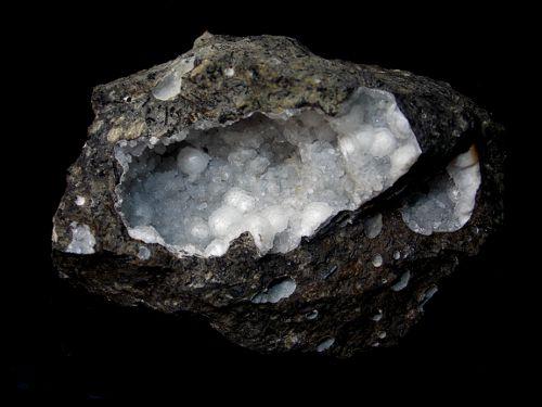 Velikost vzorku 8,1 x 6,1 x 3,6cm, velikost dutiny 5 x 2,5cm, velikost dominantního kulovitého agregátu thomsonitu 7mm. Estetická a nepoškozená ukázka. Vzorek má seříznutou základnu.