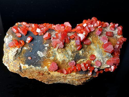 Pěkný vzorek s červenými xx vanadinitu na matrix pocházející z marocké lokality Mibladen o celkové velikosti 10,2 x 5 x 4,5cm. Velikost největšího x 9mm.
