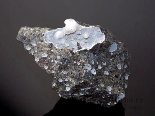 Velikost vzorku 7,8 x 4,2 x 4,5cm, velikost dutiny 4 x 2,4cm, velikost dominantního kulovitého agregátu thomsonitu 8mm. Estetická a nepoškozená ukázka.